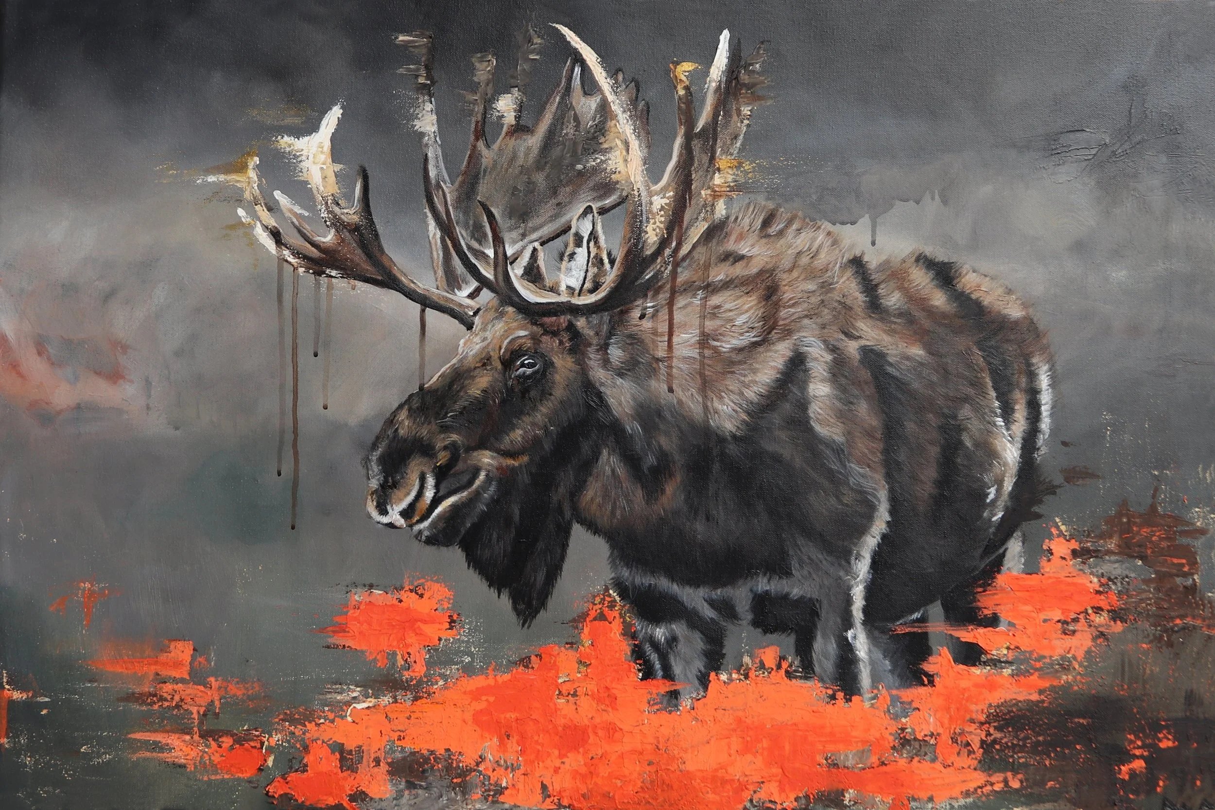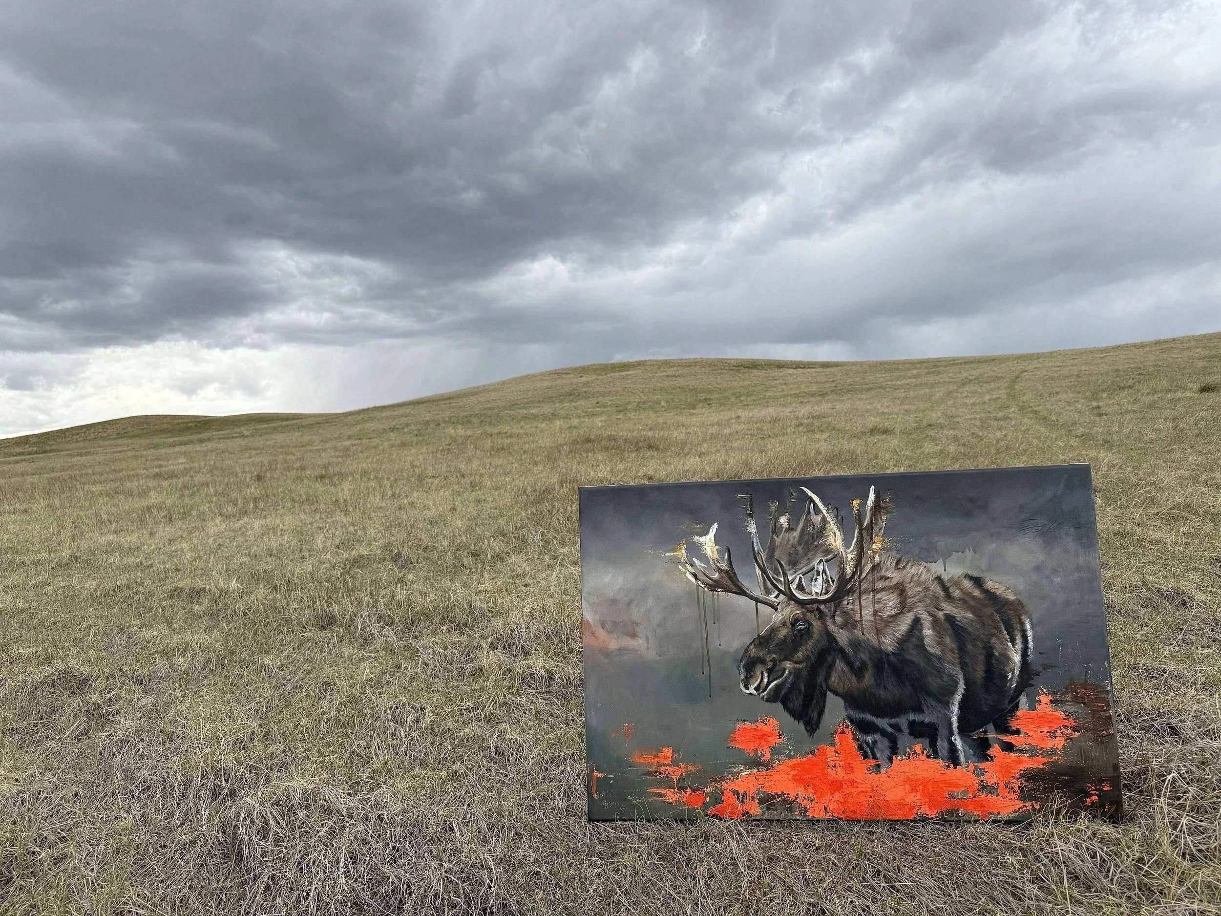 On my drive back from California in the Uhaul I spotted a beautiful moose drinking from a little river on the side of the road. After driving 2500 miles within 4 days it just seemed like such a miracle on the side of a freeway - that told me to keep going when I was utterly exhausted. The entire hell drive was just mind over matter, telling myself I can do this. “Wade through” is a 36X24 mixed media painting, reminding you to get through it, and that pain in only temporary.