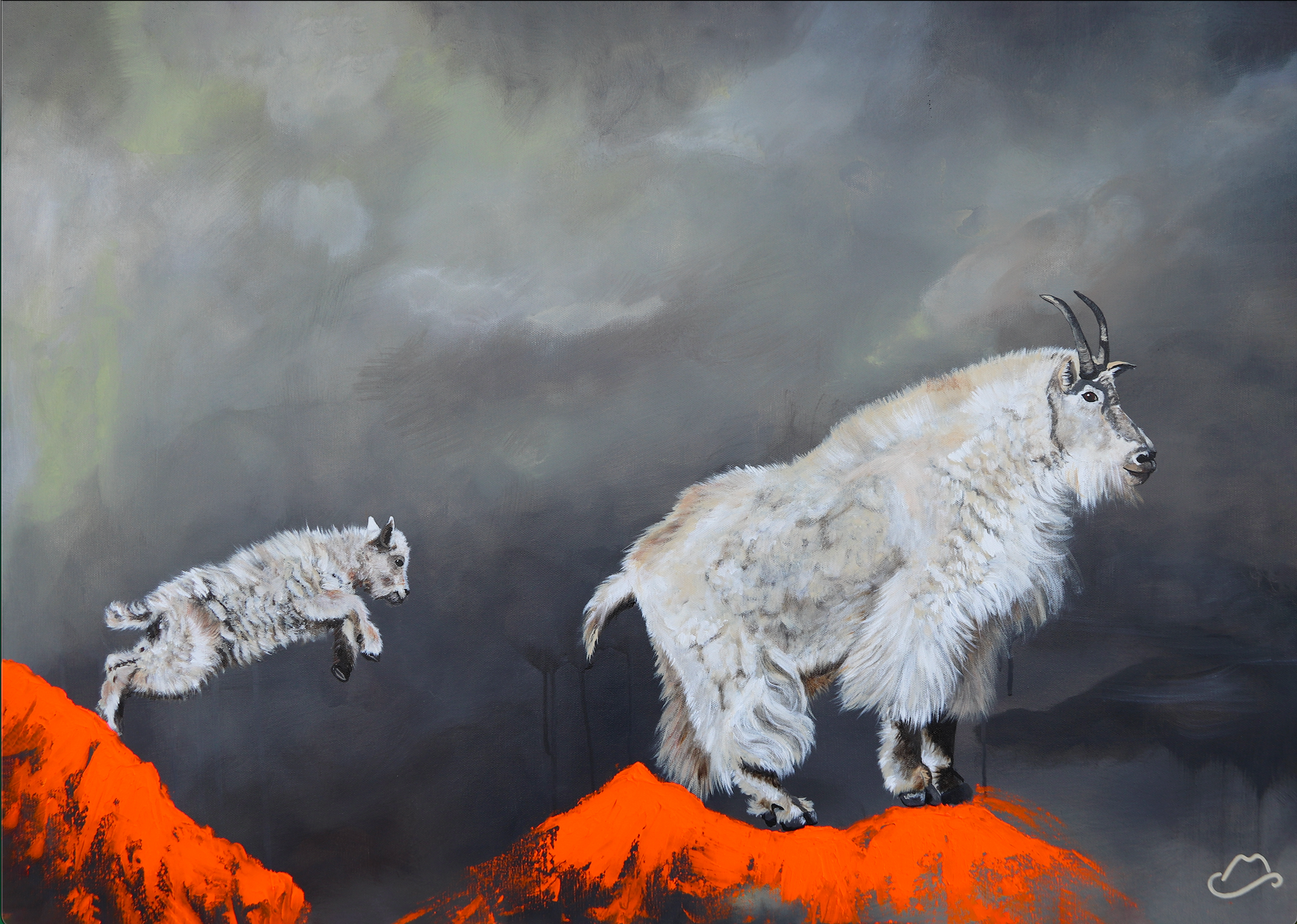In the high alpine where the air is thin and the earth falls away beneath your hooves, survival depends on something deeper than sight- it takes instinct, courage, and a quiet trust in those who came before you. This piece captures a single, breath-held moment: a young mountain goat launching into the unknown, eyes locked on its mother. There’s no rope, no safety net - just raw, inherited wisdom and the unshakable belief that if she did it, so you can you.